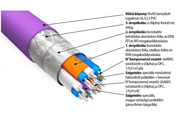 A vastagon aranyozott csatlakozók, valamint a kábelben lévő összes fémvezető a Furutech Alpha nevű, két fázisból álló (Cryo-gázos kezelés, majd ezt követően mágnesesség-eltávolítás) folyamatán is átesett. A mellékelt ábrán megfigyelhető, hogy törekedtek az érpáronként (is) alkalmazott, extra minőségű árnyékolásra. Az ultramagas sebességen továbbított jel ezüstözött micro-OFC rézszálakon halad.