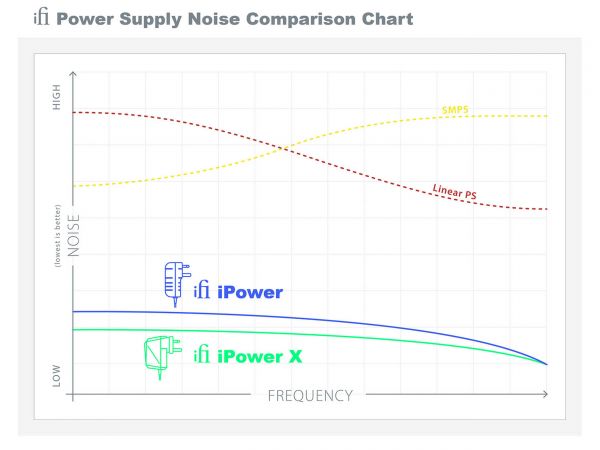 Az iPower X-ben bevezetett legújabb generációs zajcsökkentési módszer sokkal hatékonyabb, mint a szokásos szűrőblokkok. Megszünteti a nemkívánatos zajokat, és sokkal szélesebb tartományban működik, megszabadítva a csatlakoztatott eszközt a zajos bemeneti áramtól. Az iFi mérései alapján a korábbi generáció is csendesebb volt, mint az audiofil lineáris tápegységek, és 1000-szer kevésbe zajos, mint a szokásos SMPS fali adapterek.