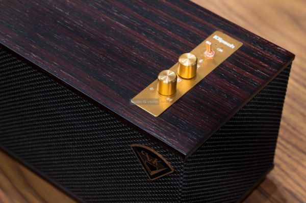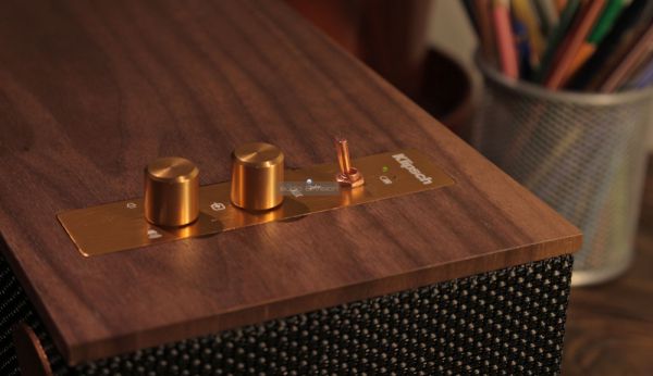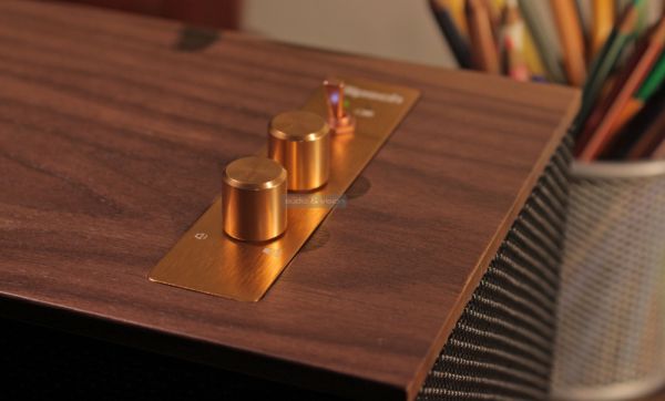 A vörösréz lemezen díszelgő két potméter hangerő állításra és bemenet választásra szolgál. Utóbbi helyett talán bölcsebb lett volna egy sima kétállású kapcsolót elhelyezni, mivel összesen két jelet (Bluetooth vagy analóg sztereó) képes megszólaltatni az eszköz. A ki- és bekapcsolásra hangulatos billenőkapcsoló szolgál.