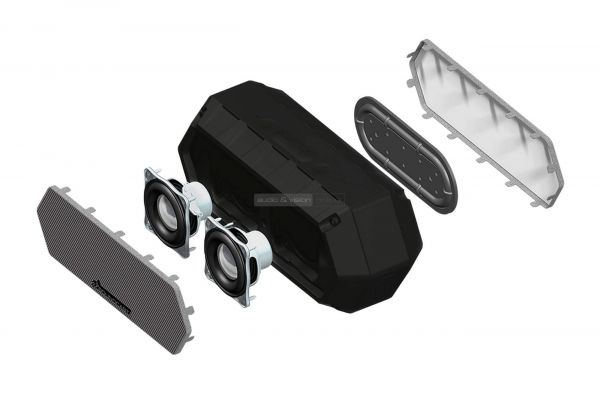A Soundcast VG1 érdekes, meglehetősen robusztus külsővel rendelkezik. Talán a leginkább rá jellemző szó a futurisztikus, köszönhetően a szögletes formának és az anyaghasználatnak. A hangszóró mindkét oldalán elhelyezkedik egy-egy fémhatású műanyag háló (e mögött pedig a két alumínium membrános hangszóró és egy passzív basszus radiátor van), a többi rész gumírozott. Ez nem véletlen, ugyanis az eszköz IP67 tanúsítvánnyal rendelkezik, tehát teljesen védett a szilárd anyagok és szennyeződések ellen, ezen kívül vízálló. Így nyugodtan magunkkal vihetjük medencés bulikra, vagy más vízi kalandokra, vagy ha koszosnak találjuk, akkor lemoshatjuk csap alatt.