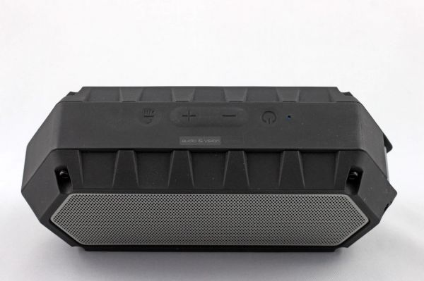A baloldalon egy kis alumínium rudacska található, erre akaszthatjuk fel a mellékelt hevedert. Érdekesség, hogy amikor először emeltük meg az egyébként nem nagynak mondható hangszórót, akkor kissé meglepődtünk a súlyán, ami 468 gramm. Persze nem kell ettől megijedni, mert bármilyen táskában elfér, nem tartozik a sérülékeny eszközök közé, ha odacsapjuk vagy leejtjük, akkor sem fog rögtön tönkremenni, eltörni, köszönhetően a gumírozásnak és a strapabírásnak, így nyugodtan vigyük magunkkal kirándulásokra, bulikra is.