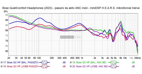 Mérés alapján látható, hogy bekapcsolt módban, aktív ANC-vel a fejhallgató elektronikusan több helyen kiegyenlíti a hangszórójának tehetetlenségét, botlásait. Mintha egy Dirac futna benne. 40 Hz alatt szerfelett magabiztos, ami annak is köszönhető, hogy az ANC kirekeszti a külső, romboló mélyhangokat, így a kamrában lévő morajlásokat jobban kontrollálja, mint egy passzív füles. 5-6 kHz között beesik, ami szerintünk összefügg a bizonytalan ütős hangszerekkel, ugyanakkor 8 kHz-nél megugrik, ami a Bose viszonylatban szokatlan artikulációra, erősebben fókuszált magashangokra egy lehetséges magyarázat.