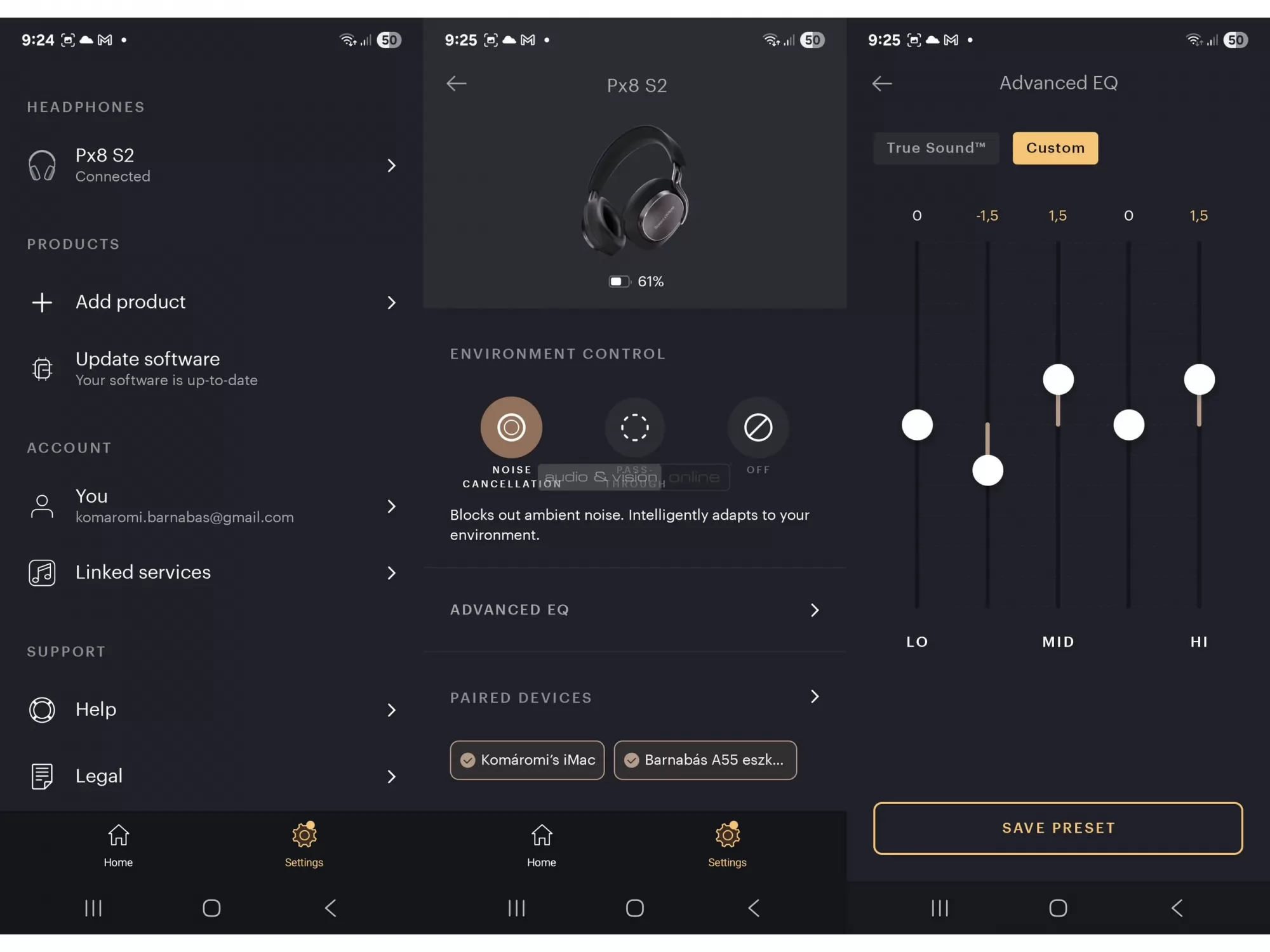 A Bowers & Wilkins Music alkalmazást nincs túlbonyolítva, könnyű megtalálni benne az ANC módkapcsolót (ugyanez elérhető a bal oldali fizikai gombbal), a párosított eszközök listáját és a hangszínszabályzót (EQ), mely a korábbi kiadástól eltérően már nem kettő, hanem ötsávos volt. Azt érdemes tudomásul venni, hogy az egyedi EQ profillal nem fog változni a fejhallgató hangkarakterének központi része, de ha alapbeállításon túl vékonynak vagy erősnek véljük a mély/közép/magas hangokat, akkor kismértékben tudunk azokon finomítani e funkcióval.
