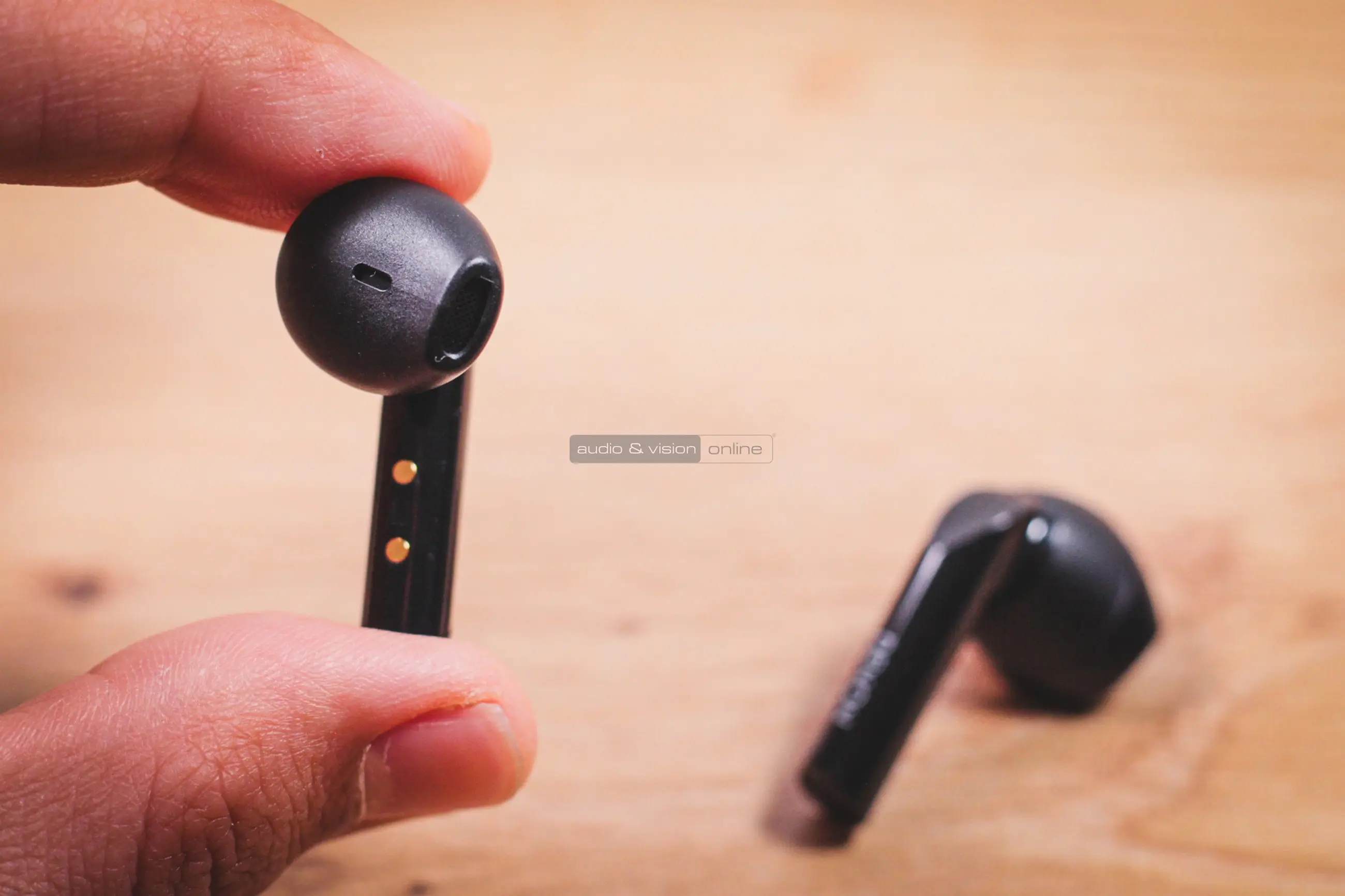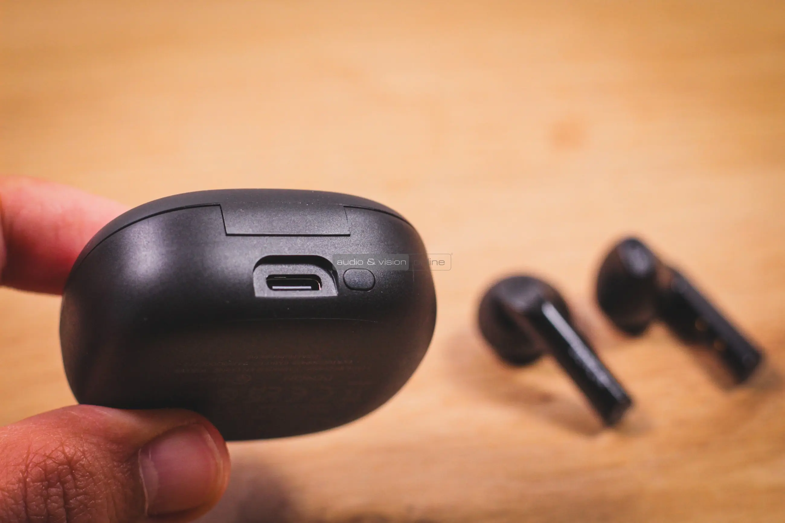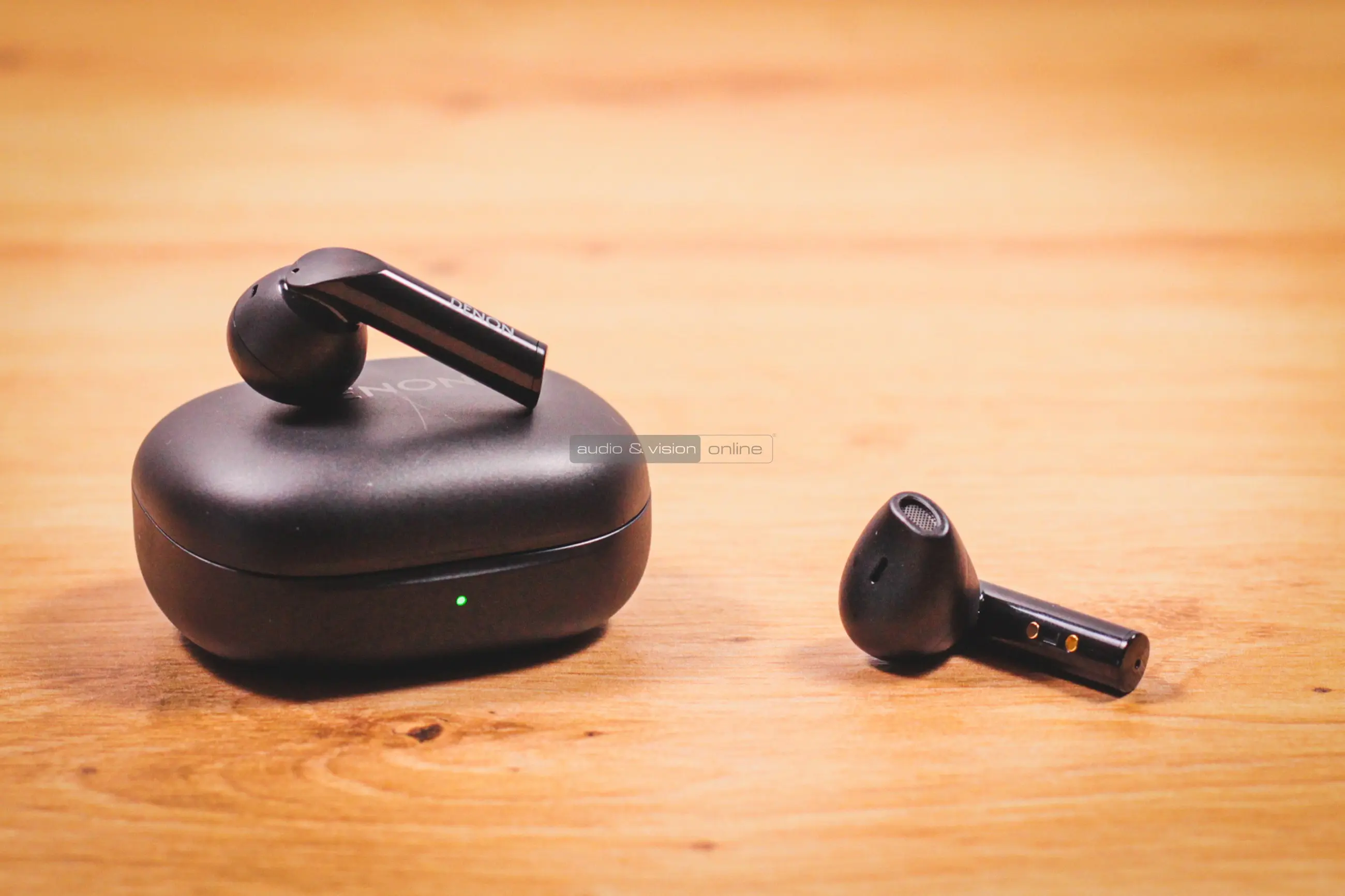 A minimalista, fehér papírdobozban érkező fülhallgató tartozéka mindössze egy töltőkábel - szilikon illesztékek ehhez az alakhoz nincsenek, mivel nem zárja el a hallójáratot, mindössze a fül középső részébe "akaszkodik bele". A töltőtok letisztult és viszonylag kicsi, szűkebb nadrágzsebben is egész jól elfér. Közepén egy RGB LED mutatja az akkumulátor töltöttségét, a fülhallgatók nem világítanak, nem is szükséges. A tok hátuljára került egy USB-C töltő csatlakozó és egy többfunkciós gomb. Utóbbival lehet ellenőrizni az aktuális töltöttségi szintet, elindítani a kapcsolatkeresést vagy visszaállítani a gyári beállításokat.