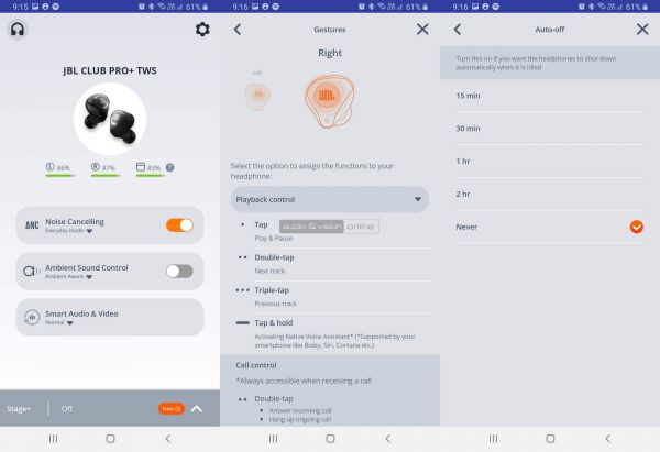 A Club Pro+ TWS fülhallgató a jól bevált JBL stílusjegyeket örökölte, így jellemzően inkább könnyűzenei stílusokkal bánt előnyösen. A hozzá tartozó alkalmazásban engedélyezhettünk énekre/hangszeres zenére optimalizált EQ profilokat, de a gyárilag neki szánt általános hangzás bizonyult hosszú távon a leginkább ütős és kerek élménynek.