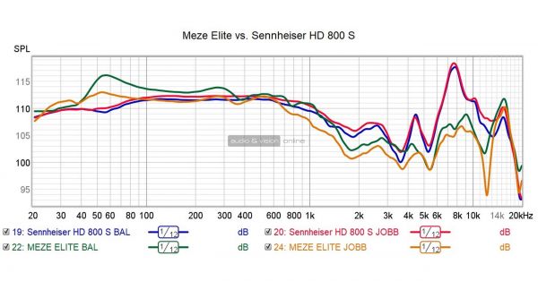 Ami egyeseket zavar a Sennheiser HD 800 S-ben, azt kompenzálja a Meze Audio ELITE. Grafikonon nézve és füllel is megállapítható, hogy a két füles szinte más világ. A Meze majdnem kétszeres feláráért cserébe megbocsátóbb és könnyűzenére fogékonyabb hangzást nyújt.