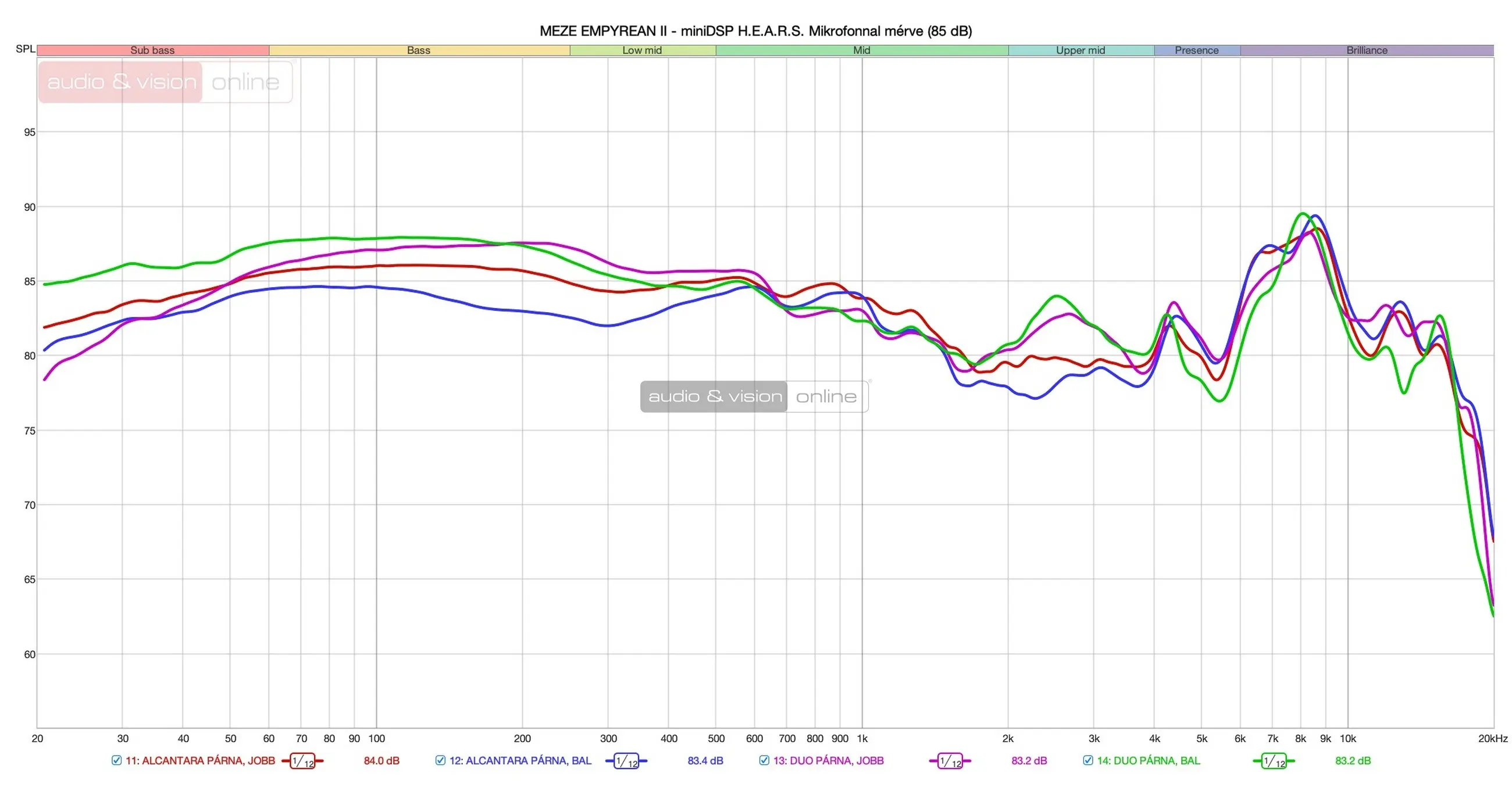 A fejhallgató hangszórója 8 Hz-től működik, ami azt eredményezi, hogy 20 Hz-en már stabilan kezd munkához. A mérést szép linearitást mutatott 1 kHz-ig. 10 kHz fölött volt egy 4-5 dB mértékű emelkedés, ami szerepet játszhatott az térbeli részletek határozottabb fókuszálásában. Érdekesség, hogy a különböző fülpárnák hangra gyakorolt hatását a mért ábra is egyértelmű különbségként mutatja.