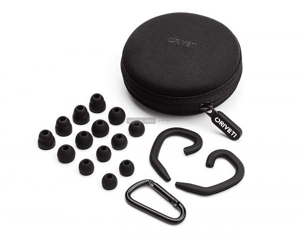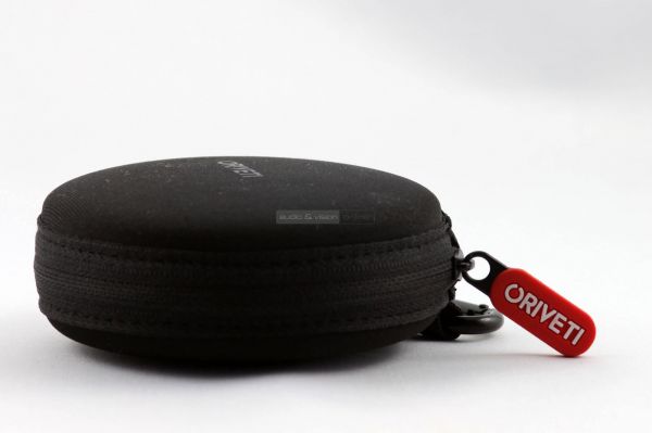Az Oriveti igényes, rendezett csomagban tálalja termékét. Jár hozzá egy kemény falú, korong alakú, cipzáras védőtok, többféle méretű szilikon illesztékkel. Ha a fül mögé bújtatott kábelt szeretnénk elvezetni, akkor segíthet a szintén mellékelt gumi horog pár is, amit szemüvegesek nem igazán fognak tudni használni.