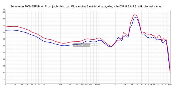 A két oldal hangnyomásszintje között helyenként látni 2-3 dB különbséget is, ami a Sennheiser referencia fejhallgatók esetén zavaró lehetne, de itt nem okoz problémát. Füllel egyébként sem lehet hallani az eltérést. Figyelemre méltó dombról indul a basszus, 20, 30 és 40 Hz-en is meglehetősen határozottak a MOMENTUM 4 mélyei. Aki soknak találja, szoftveres EQ-val bármikor csökkentheti. 4 és 5 kHz-nél jókora ugrás figyelhető meg, ami szerepet játszhat a középső és magas hangok esetén markánsabb, kontrasztosabb részletezésben. Első ránézésre úgy tűnik, hogy a HARMAN referencia görbéjét vették célba, ami élvezhetőség szempontjából nem baj, így adott a populáris karakter. Még 17 kHz-nél is képes hangokat megszólaltatni a membrán, ami vezetéknélküli aktív ANC-s füleseknél ritkaság és pozitívum.
