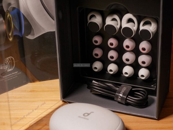 A Liberty 2 Pro csomagolása 6 pár fülillesztéket és 2 pár gumitámasztékot tartalmaz. Utóbbi a fül belső oldalán, a fülgerinc alá ékelődve nyújt további stabilitást. A hangszóróház fényes és matt műanyagból készült, fémhatású külső lemezzel. Ahogy fotókon is látszik, a Liberty 2 Pro nagyobb, mint a legtöbb TWS fülhallgató, viszont az akkumulátort, mikrofonokat és elektronikát tartalmazó rész lapos, hosszúkás, ezáltal egész dizájnos.