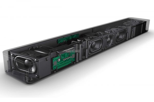 A hangrúd felépítése három csatornára oszlik, azaz a center rész mellett a végekben is helyet kapott egy-egy előre fordított teljes sávú ovális hangszórót a hatékonyabb térhangzás eléréséhez. Ezzel összesen 4 db ilyen hangszóró cibálja a gondosan kialakított reflexcső rendszerekben a levegőt, amely ilyen méretek mellett, vélhetően komoly basszusokat eredményezhetnek. Ezeket a precízen megtervezett terelőlapokat "Quiet Port" technológiának nevezték el, mellyel igyekeztek nulla közelébe redukálni a káros torzításokat vagy "portzajokat", hogy az a kevés mélyhang, amire a hangrúd képes, a lehető legtökéletesebb legyen.