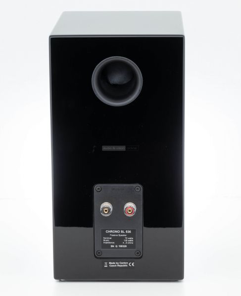A hangdoboz hátoldalán található a felső szekcióba elhelyezett reflexnyílás, valamint a szintén jó minőségű és ergonomikus, aranyozott banándugós kábelcsatlakozó terminál.