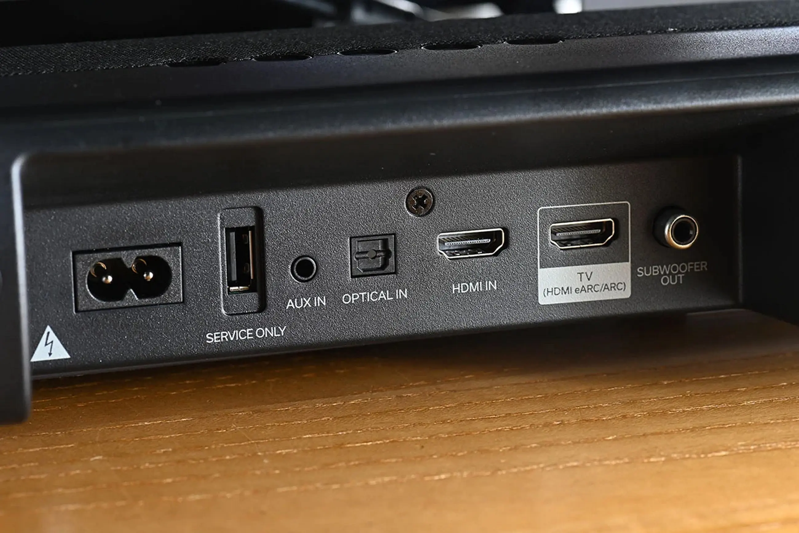 Hátul borotvacsatlakozót helyeztek el az áramfelvételhez, van USB, AUX, optikai és 2 HDMI bemenet melyből az egyik eARC, és még SUB kimenet is, tehát különösebb panaszra nem lehet okunk.