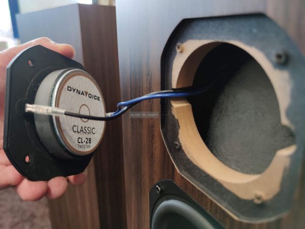 A Dynavoice CL-28 álló hangfal kizárólag dió és fekete színben kapható, ezekhez idomul az előlapot takaró védőszövet, ami lehet sötét vagy retró szürke, ráadásul mindkettőt megtaláljuk a dobozban, így még könnyebben az enteriőrhöz igazíthatjuk a külsejét. Egymással párhuzamos oldallapokat alkalmaztak, melyek anyaga vastag MDF, belül pedig nem hiányoznak a megfelelő merevítések, ahogyan a csillapítóanyag sem. A 23,6 kg-os dobozok alsó lemezén M8 szerelvények találhatók a mellékelt fém tüskékhez, valamint ellenfuratokat találunk a puha csillapító lábak illesztésére, így a stabilitással nem lesz gondunk.