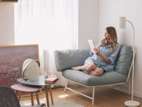 A Studio 8 továbbra is egy UFO benyomását kelti, amit az élére állítottak. Fémgyűrű veszi körül, ami egyszerre tölti be láb és hordozófül szerepét. A döntött, egymást átszelő kör alakú részek időtlen, elegáns hatást keltenek. Nem utolsó szempont, hogy az egyhangú "cső" vagy "kocka" formákhoz képest ezt az alakot több női ismerősünk is dicsérő szavakkal illette. A korábbról ismert fekete és kék színeken kívül immár egyértelműen nőiesebb, pezsgő kiadásban is rendelhető. Az ár cikkünk írásakor mindegyik esetben 120 000 forint.