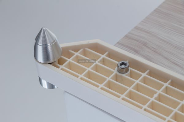 A sajtófotók alapján kifejezetten piszkálta a fantáziánkat a dobozok talpa, ami ránézésre, jóval magasabb kategóriát idéz. Nos, félig meddig meg is lepődtünk a megoldáson. A pontosan ugyanolyan selyemfényű talpak anyaga ugyanis egyszerű, könnyű és olcsó, de jól merevített és igényesen kidolgozott műanyag, ám a tüskék már három részből összeálló, forgácsolt alumínium darabok, melyekkel tökéletesen beállítható és stabilizálható a méretes hangfal. Fa padlóhoz a tüske helyett a mellékelt "gumituskókat" érdemes használni.