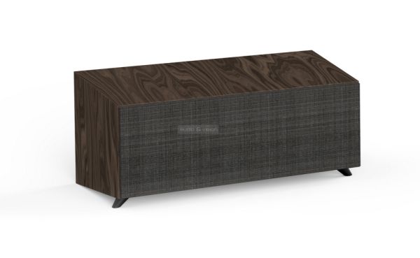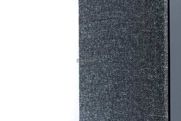A hangsugárzókat takaró keretre nem a szokványos, fekete hangszóróselymet feszítették, hanem kevert színű, erős szálú, szinte bútorszövet vastagságú vásznat. Ez egészen egyedi, rusztikus texturát eredményez.