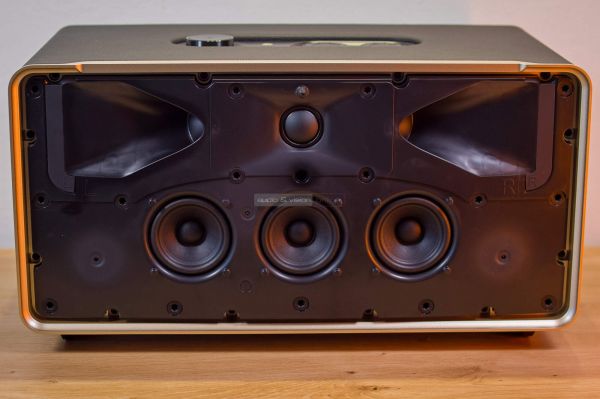 Elsőre egy rádiószerű eszközt látunk, ami nyomokban a '70-es éveket juttatja eszünkbe. Az előlap kockás mintája a hőskori Maxell kazettareklámban szereplő JBL L100 szivacsos védőrácsa előtt tiszteleg. Mindezt selymes aranykeret és bőrhatású textúra a ház oldalán, illetve tetején teszi időtlenné. A lekerekített sarkok és az enyhén ívelt előlap játékos, szemnek barátságos formát eredményez. A doboz masszív, pillérszerű talpakon áll, melyek aljára további gumi darabokat illesztettek.