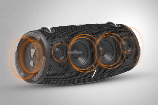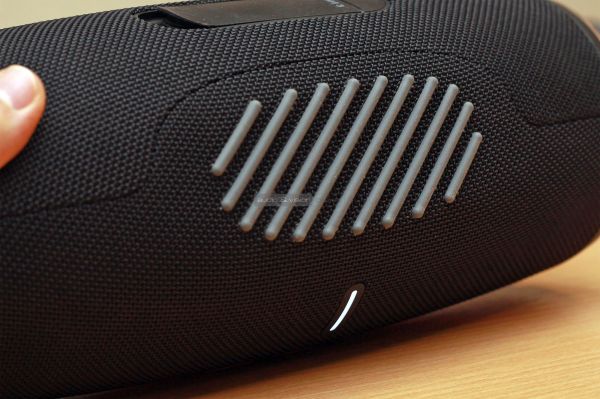 Ugyancsak fent sorakoznak a vezérléshez (PartyBoost párosítás, hangerő, Bluetooth párosítás, be/kikapcsolás, zenei navigáció) szükséges gombok. A nano-szálas, víztaszító huzattal ellátott test két oldalát felkiáltójellel dekorált passzív basszus radiátorok zárják.