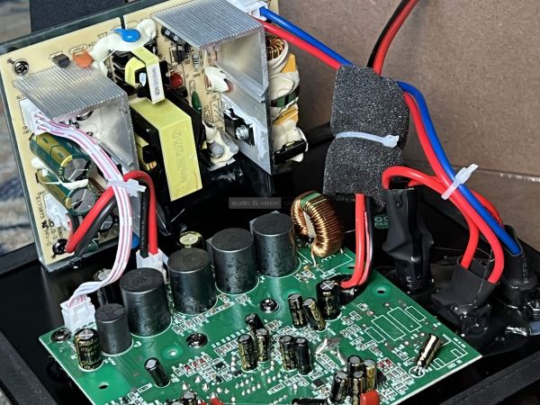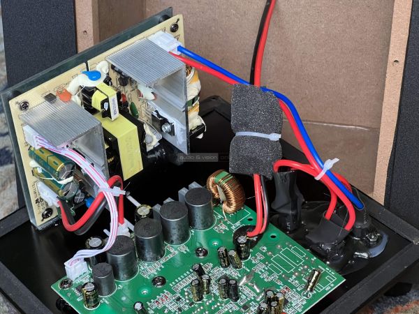 Hátul viszont található állapotjelző LED, az erősítőt tartalmazó panelen, egy IEC 7 (másnéven magnó, borotva, vagy piskóta) tápaljzat és egy főkapcsoló társaságában. Sztereó RCA bemenet fogadja a jelet.