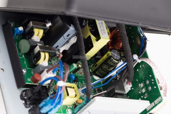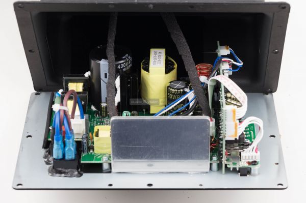 Nem hagytuk magunkat és szétkaptuk, ezt az alsó lap eltávolításával sikerült megoldani. Mögötte az említett Q400b belsejéből ismerős alkotóelemeket pillantottuk meg: vastag szivacslapot, az szerepel virtuális térfogatot növelő csillapítóanyagként, burkolt erősítő egységet, védve azt a membrán léglöketeitől. Ezt a burkolatot könnyedén el tudtuk távolítani, akár laikus, akár műszaki szemmel nézve, egyaránt bizalomgerjesztő látvány tárult elénk, mind az alkotóelemekre, mind az elrendezésükre értve. A topológia D osztályú, az RMS teljesítmény 300 W.