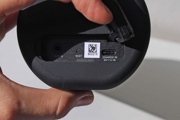 Körömmel nyitható gumifedél mögött találunk még egy 3,5 mm-es Jack és egy USB-C aljzatot. A B9/800 kb. akkora, mint egy termosz (75x210x87 mm), ezáltal az íróasztal sarkán vagy hátizsákban egyaránt kényelmesen elfér.