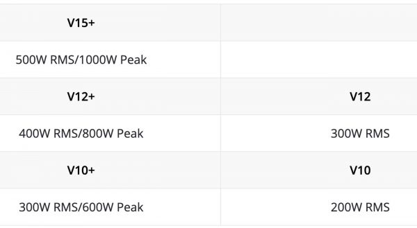 A V10+ (200 W RMS), V12+ (300 W RMS) és V15+ (500 W RMS) neveiben - ahogy ez megszokott - a szám a hangszóró átmérőjét jelenti hüvelykben. A THX minősített V12+ és V15+ érdekessége, hogy telefonos alkalmazáson keresztül finomhangolhatók.