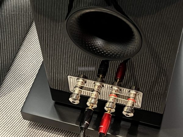 A hátsó reflexnyílás kerekített szélén golflabda felszínéhez hasonlóan, kör alakú mélyedések segítik az egyenletesebb légáramlást, megelőzve a csőzajt, finomítva a basszust. Igaz, hogy ez évek óta változatlan Bowers & Wilkins motívum majdnem az összes hangsugárzón, de attól még említést érdemel. A csatlakozók viszont teljesen újak, helyesebben ugyanazok, mint amiket a 800 D4 hangfalakon is alkalmaznak. Nemcsak szebbek, vízszintes elhelyezésük által a kábel csatlakoztatása is könnyebb.