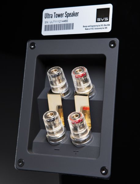 A hátlapon pedig akkora reflex cső van, amin egy átlagos férfi kar könyékig eltűnik. Ehhez jókora szivacsdugó jár, hogy ha netán fal közelébe szeretnénk tenni, akkor lezárhassuk az orkán útját. Kicsit lentebb lakik a kettős kábelezésre és erősítésre alkalmas csatlakozó. A hangfal alján természetesen ott van a szokásos menetes anya tüskéknek. Az SVS itt egy újabb plusz pontot is begyűjtött azzal, hogy nem csak tüskéket, de gumi lábakat és alátéteket is adnak az Ultra Tower hangfalakhoz.