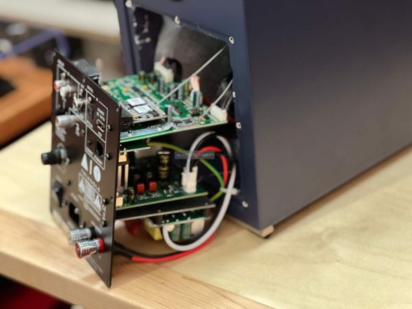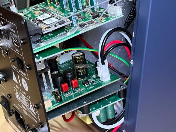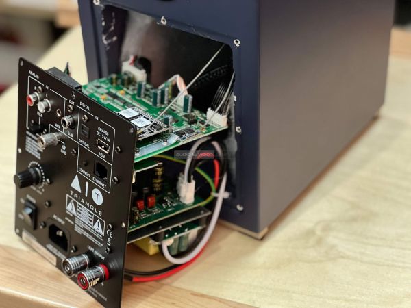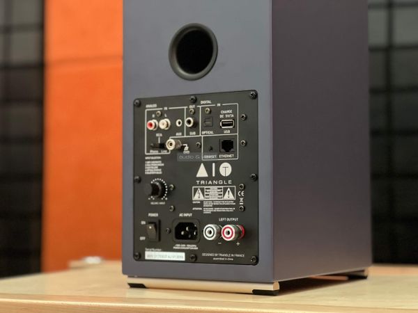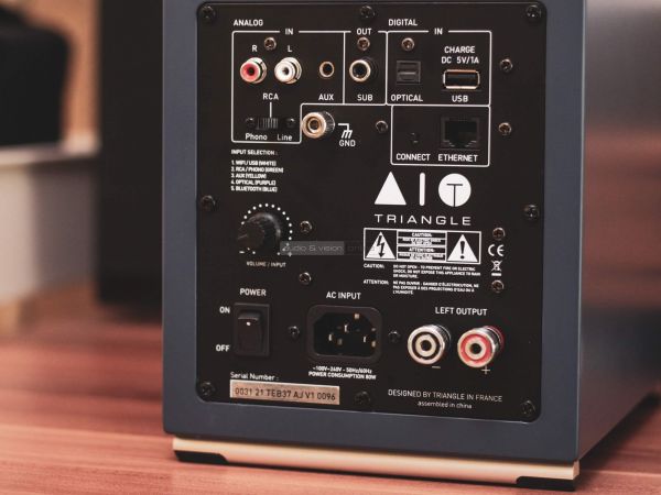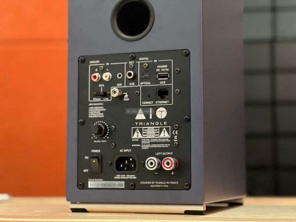 A Triangle AIO TWIN jobb oldali doboza tartalmazza az erősítőt, ehhez csatlakoztatható a bal oldal, a mellékelt kábel használatával. A phono RCA bemenet egy kapcsolóval állítható vonalszintűvé és úgy bármilyen analóg forrást fogad, nemcsak vinyl lemezjátszót. Mellette egy 3,5 mm-es Jack bemenet is biztosított. Az optikai hangbemenet megléte jó, mert így szinte bármilyen korszerű televízió jelét fogadhatja. Viszont manapság egyre több aktív hangfalpáron megtalálható HDMI ARC bemenet is, ezért örültünk volna, ha az AIO TWIN ilyet is tartalmaz. Valószínűleg a streaming funkció és a HDMI együtt már jelentősen megemelték volna az árát.