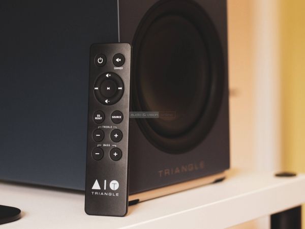 Jó fogású távvezérlőt mellékeltek az AIO TWIN-hez. Általa nemcsak jelszint vezérlésre (hangerő szabályzásra), hanem bemenet választásra, némításra és EQ-ra (hangszín szabályzás) is van lehetőség. Ezen kívül zenei navigációra szolgáló gombok is kerültek rá, amelyeket hálózati funkciók vagy Bluetooth kapcsolat közben is tudtunk használni. A jobb oldali hangsugárzóban lévő infra szem viszonylag nagy távolságból és széles tartományban fogadta a jelet, nem kellett feltétlenül "rácélozni".