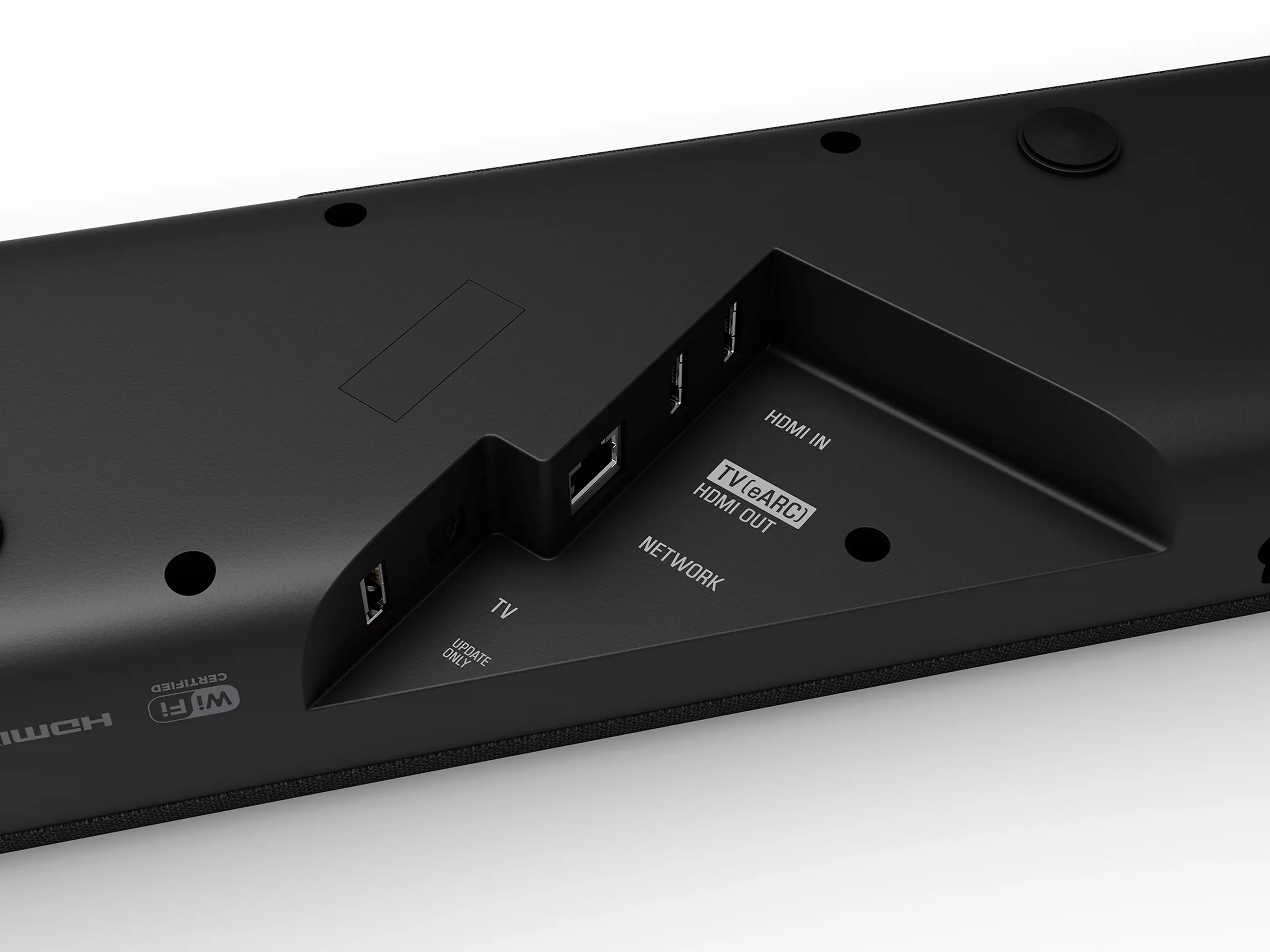 Belül 2 darab 46x66 mm-es ovális frontsugárzót, 2 darab 52 mm-es magassági és szintén kettő 75 mm-es mélysugárzót kínál, tehát a nagyobb modellhez hasonlóan itt sem alkalmaztak centersugárzót. Sebaj, így is jut nekünk összteljesítményben 180 watt, sztereó, normál, film, játék üzemmód és ugye Dolby Atmos térhatás is. A Bass Extension opció a mélytartományt növeli meg, a Clear Voice a beszédhangokat emeli ki, a Spotify Connect, AirPlay 2 és TIDAL Connect pedig a zenehallgatóknak kedvez.