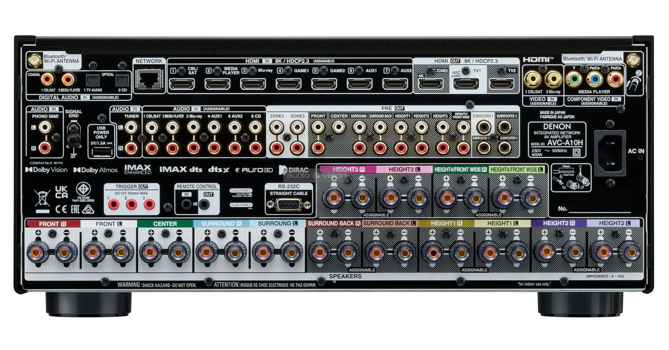 A Denon A sorozatú házimozi erősítőitől megszokott, hogy az iparág legmagasabb minőségi elvárásai szerint készülnek. Az új AVC-A10H belsejébe a lehető legjobb alkatrészekre esett a választás, beleértve egy új ESS DAC szettet (9 db kétcsatornás audiofil DAC biztosít jelet mind a 17 kimenetnek). Tetszés szerint ki tud szolgálni 5.1.2-től 9.4.4-ig (vagy 7.4.6, ha több üléssorhoz kell magassági sugárzót biztosítani) különböző hangfalszetteket. Támogatottsági listáján szerepel a Dolby Atmos, DTS:X, Auro 3D és a Sony által kifejlesztett 360 Reality Audio is.
