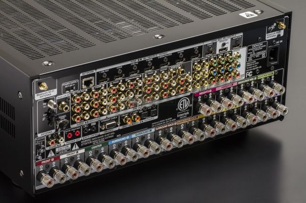 A hátlap teljesen tele van pakolva aranyozott csatlakozókkal, mégsem kelti a túlzsúfoltság látszatát, mert az elrendezés mintaszerű. Ezt a jelzőt alkalmasint fogjuk még használni, mert ez fejezi ki legjobban a véleményünket. Ennyi hangszórókábel aljzatot még sosem láttunk házimozi erősítőn: pontosan 30 darab, megszámolni is fárasztó feladat. Hogy miért kell ennyi, arra pár sorral lejjebb visszatérünk.