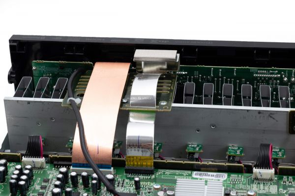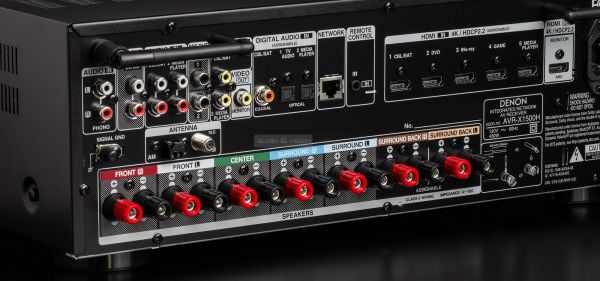 Az erősítő hátoldala sem egyezik meg teljesen a tavalyi modellével, kicsit módosult a csatlakozók kiosztása. A digitális hangbemenetek közül elhagyták a koaxiálist (csak a két optikai maradt meg), cserébe viszont megjelent a phono bemenet, amellyel az előd AVR-X1400H még nem rendelkezett. Azt nem lehet pontosan megjósolni, hogy meddig tart a bakelit lemezek reneszánsza, nyom nélkül elmúló futó divatról van-e szó, vagy piaci részesedésük beáll-e egy stabil (bár a fénykornál azért jóval kisebb volumenű) szintre, mindenesetre dicséretes a phono bemenet megjelenése. Még ha minősége nem is éri el egy dedikált, önálló dobozos előerősítő színvonalát, de így az AVR-X1500H külön beruházás nélkül, helyből kínálja a fekete lemezekkel való ismerkedés lehetőségét. Ha pedig valaki ráérez az analóg zenehallgatás ízére, később igénye szerint feljebb tud lépni. Mindenesetre úgy néz ki, a Denon hisz a formátum létjogosultságában, ezért is építi be az előerősítő fokozatot egyre több házimozi erősítőjébe.