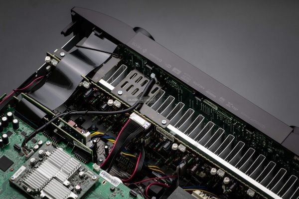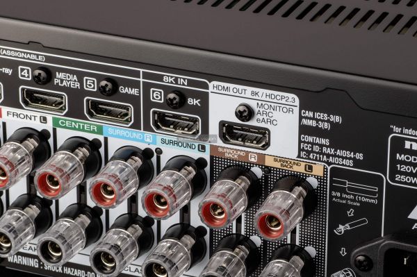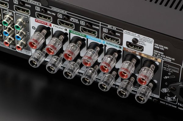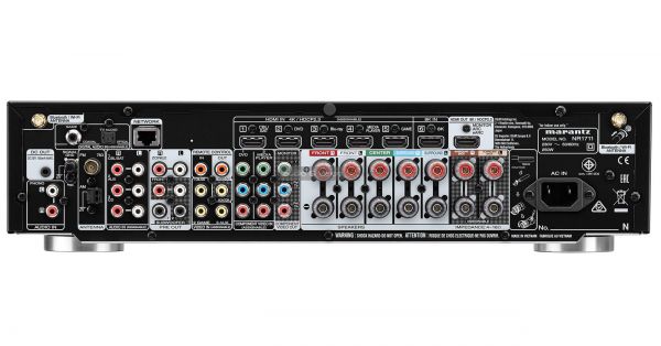 A hátlapon rendelkezésre álló helyet szinte teljesen kihasználták, így minden ott van, ami szükséges. A komponens és kompozit video be- és kimenetek ugyan egyre kevésbé fontosak, de a Marantz egyelőre nem mondott le róluk. 1 db koaxiális és 1 db optikai bemenet áll rendelkezésre, HDMI-ből azonban 6 db, amiből csak 1 db valós 8K támogatású, de a többi is tudja a 8K felskálázást.