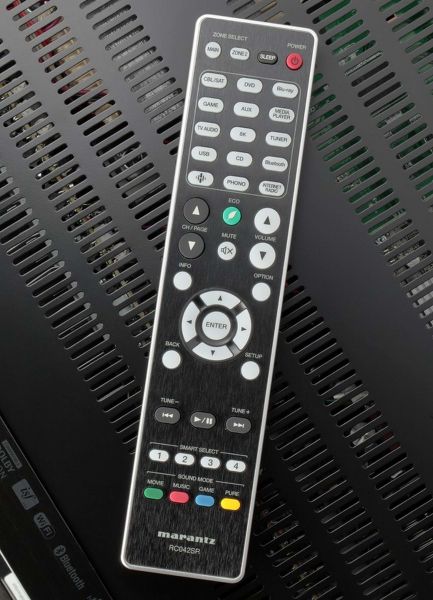 HDMI kimenetből csak egyet kapunk, van azonban MM phono bemenet és AM/FM rádió, illetve 3 pár analóg RCA bemenet, 1 pár RCA vonalszintű és 2. zóna kimenet, illetve dupla szubkimenet, ez utóbbiak sajnos nem szabályozhatók külön, mint a nagyobb modelleknél. A WiFi és Bluetooth antennák növelik meg valamelyest a készülék magasságát, de nem számottevően. A perforált fedőlap lehetne valamivel vastagabb, de megfelel a kategóriának. A megépítés a márkatársakat idézően szép, az ívek és vonalak érthetően azt követik, amit a Marantztól megszoktunk, mondhatni az NR1711 külsőleg semmit nem változott az elődjéhez képest.