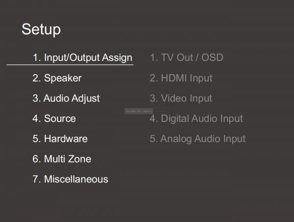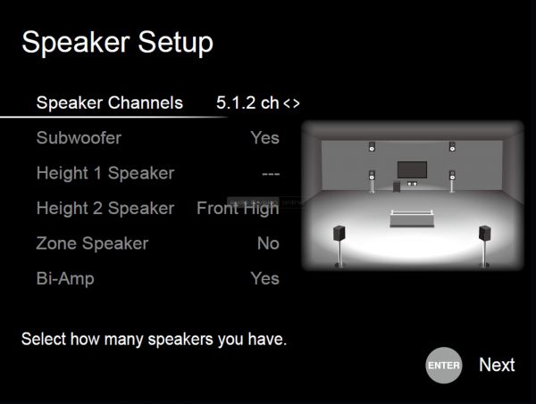 Az installálást az AccuEQ Advance mérőmikrofonos szobaakusztikai korrekciós rendszer segíti. Ez már egy továbbfejlesztett változat, több hallgatási pontra optimalizálva állítja be a hangsugárzó jellemzőket. A mérési folyamat alatt a program megvizsgálja, hogy alakulhatnak-e ki állóhullámok a szobában, és megpróbálja úgy konfigurálni a hangdobozokat, hogy ez ne következzen be. Az AccuReflex algoritmus a felfelé sugárzó, és a plafonról visszaverődő hanghullámokkal operáló Dolby Atmos dobozok és a többi, direktben sugárzó hangfal fázisát hangolja össze. A beméréssel kapcsolatos egyetlen negatív észrevételünk, hogy bár az erősítő 9.2-es, de a felsőkategóriás készülékektől eltérően nem kezeli külön a két szubládát. Az automata konfiguráláson felül kézi beállításra is lehetőségünk van, minden csatorna esetén egy 15 sávos virtuális ekvalizátorral lehet módosítani a frekvenciamenetet. Három különböző beállítás tárolható el a készülék memóriájában.