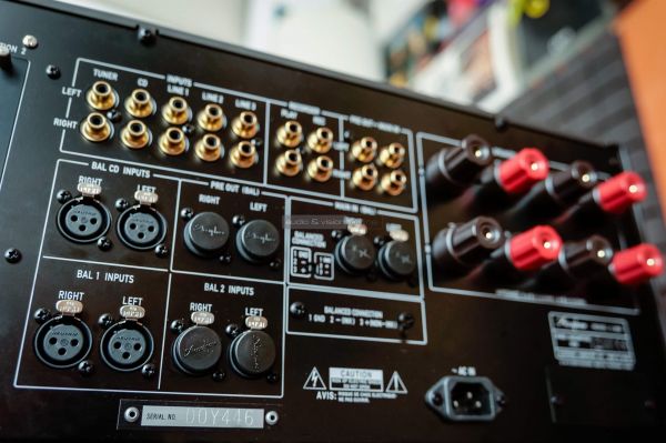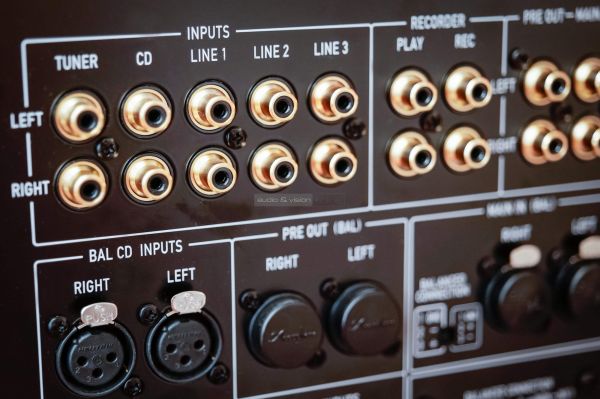 A készülék hátlapja rendezett, precíz munka, de még így is zavarbaejtően bőséges. 6 pár RCA és 4 pár XLR bemenet, (a Main In-eket is ideértve), a már említett kettős kábelezésre alkalmas, magas minőségű hangfalkimenetek, valamint 2 pár RCA és XLR kimenet alkotja a hátlap nagyrészét. Ezeken túlmenően természetesen szabványos IEC tápcsatlakozót, valamint a már említett két darab bővítőkártya-helyet találjuk. További fontos és a kategóriában sem gyakori jellemzők még a nem kevesebb, mint 1000-es csillapítási tényező, valamint a tiszta A osztályú kapcsolás, amiből nem kevesebb, mint 50 W-ot kapunk csatornánként 8 ohmon (de akár 1 ohmos zenei terhelést is lehetővé tesz az E-800, ezesetben 300 W csatornánkénti teljesítménnyel).