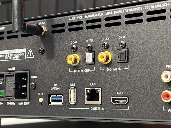A digitális oldal valamivel többrétű, hiszen LAN, USB-A, optikai és koaxiális bemeneteket nyújt, az utóbbi kettőből kimenetet is, továbbá újraindíthatjuk és alappozícióba állíthatjuk a készüléket. A HDMI ARC külön mondatot érdemel, hiszen általa összeköthetjük a készüléket a televíziónkkal, amely opció nagyon ritka egy ilyen készüléken.