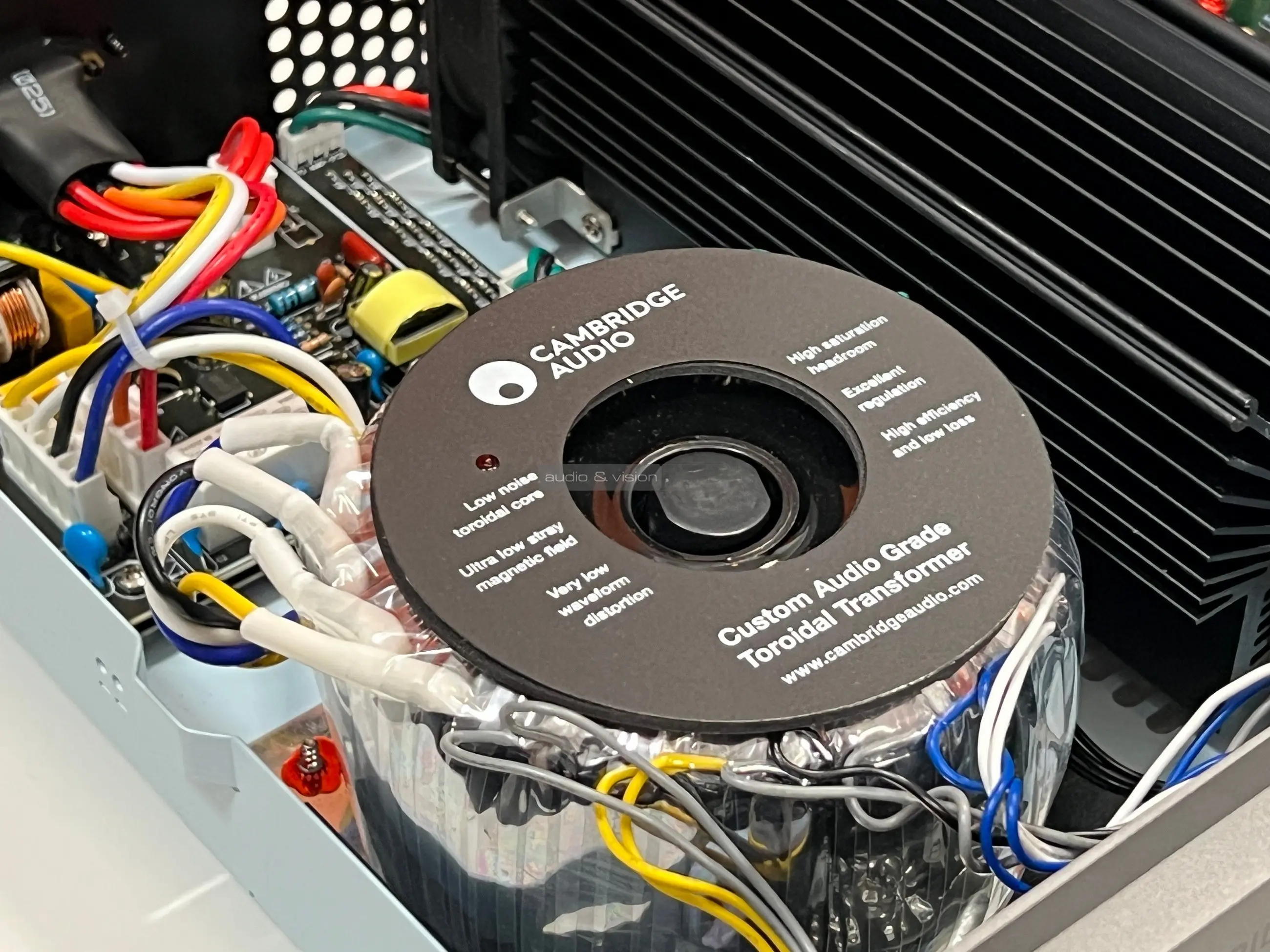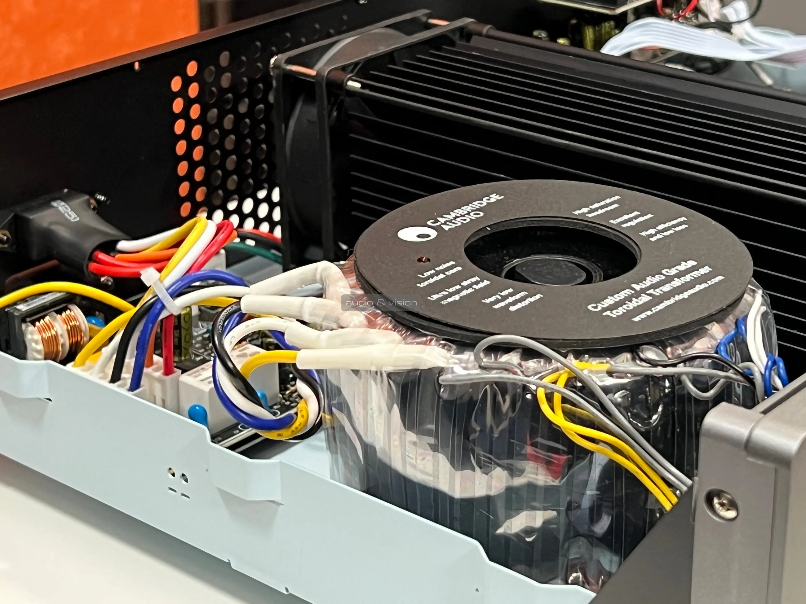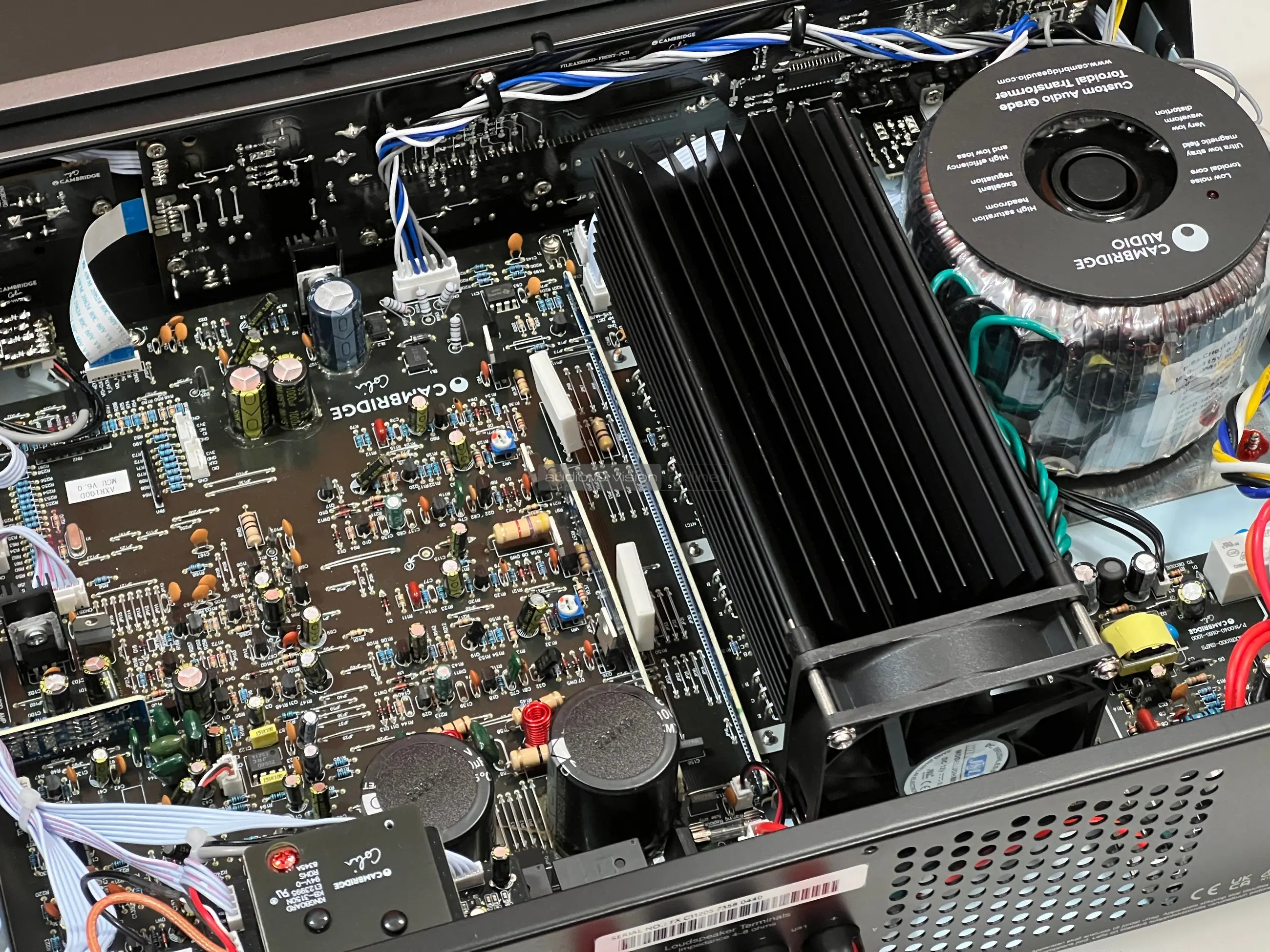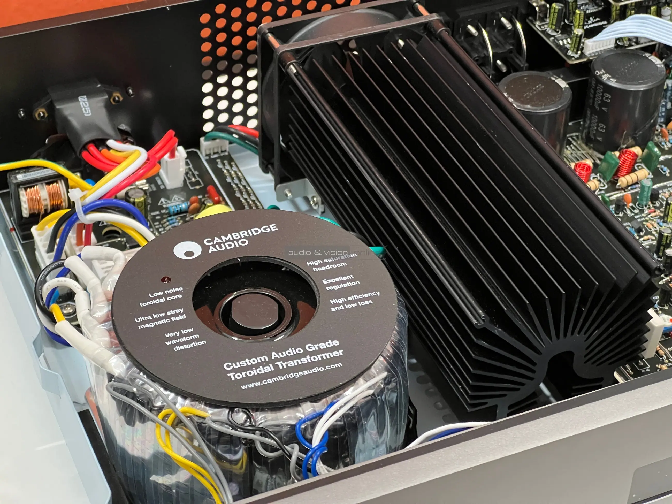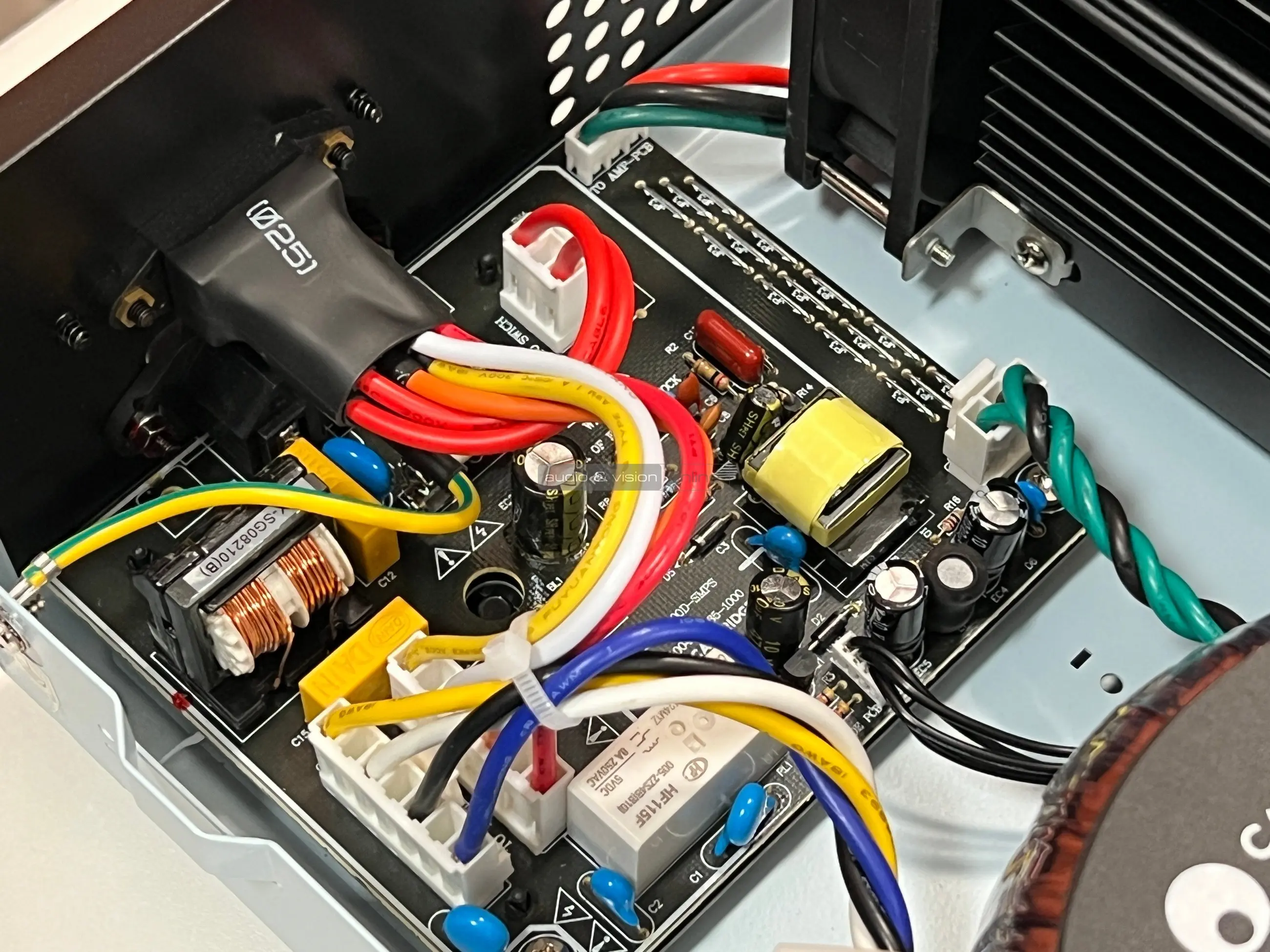 Nézzünk most a készülék belsejébe! A toroid transzformátor által 8 ohmon 100 wattot képes leadni csatornánként, ami biztosan elég lesz átlagos érzékenységű hangfalak meghajtásához, de valószínű nagyobb terhelést igénylőkkel is képes elbánni.
