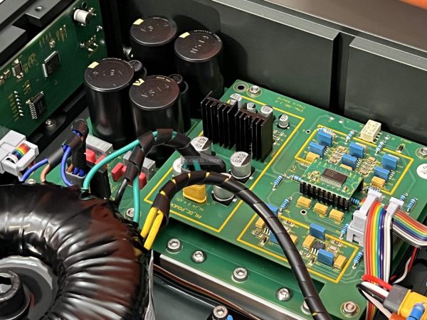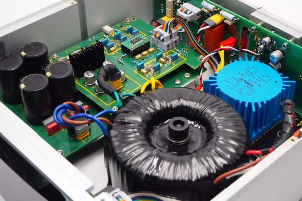 A fedőlapon találunk egy felületet, amit átlátszó üveglap véd, azon keresztül betekintést nyerhetünk részben a készülék belsejébe, amire ezek szerint büszke a cég. Jogosan! Hasonlóan a Kinki végfokjához, itt is minden a minőséget tükrözi, pedig azért más árfekvésben van az a készülék. Az elrendezés logikus, letisztult, és még a nagyméretű trafót is úgy helyezték el, hogy kellő levegőhöz jusson, a hő elvezetésében pedig a vastag alumíniumváz kap szerepet, szellőzőnyílásokat nem találunk. Pontosabban igen! Érdekes megoldás, hiszen a készüléket alulról lehet szétcsavarozni, az említett összetevők nem az alvázra, hanem a fedőlapra vannak felrögzítve, tehát fejére állt az egész világ! Így az erősítő aljára, a trafóhoz került szellőzőnyílás, valamint szétszedve a készüléket láthatjuk, hogy az alumínium nem csak kívülre került, belül az oldallapoknál több réteget, és csillapítóréteget is használtak. Gondos, alapos, egyéni és nagyon megfontolt az elgondolás és kivitelezés, amit ettől a kategóriától nem feltétlenül vártunk el.
