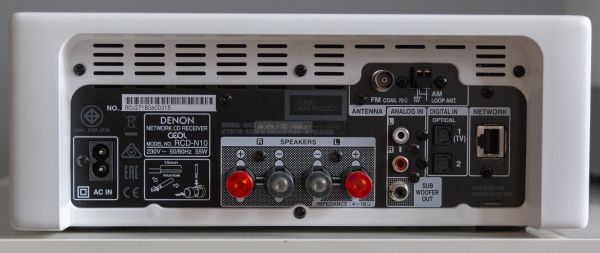 A készüléket megfordítva érkezik az első jelzés, hogy a legkevésbé sem az alsó kategóriával van dolgunk: a készülék hátlapján méretes, sztenderd hangfalkábel-csatlakozók kaptak helyet, melyek akár komolyabb példányok csatlakoztatását is lehetővé teszik. Kényelem szempontjából jó pont, hogy a csatlakozók rugós szerkezetűek, így nem kell tekergetnünk őket a kábel rögzítéséhez, ugyanakkor a lehetőségeket is behatárolja a megoldás: 2,75 mm2 keresztmetszetű Neotech kábeleinket meglehetősen nehezen sikerült belepasszírozni. Nem kellett különösebben erőltetni vagy szétszálazni, ugyanakkor nem volt a legegyszerűbb feladat. Emellett e csatlakozók banán- vagy villásdugók fogadására sem alkalmasak - de ne feledjük, mikro hifi rendszerről van szó! A hátlapon találunk továbbá két optikai, egy analóg, sztereó RCA, mélysugárzó illetve Ethernet és antenna csatlakozókat is.