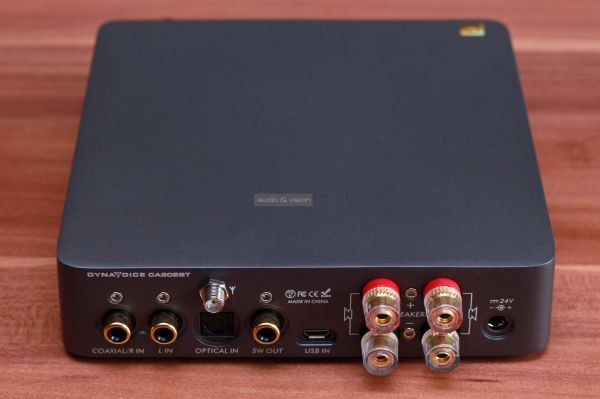 Hátul bőséges a választék a méretéhez képest, egy pár RCA bemenet, ahol a legszélső egyben a digitális koaxiális is, optikai és micro USB (felváltva a megszokott USB-B típusút, a kábelt mellékelték hozzá a csomagolásban), szubkimenet, egy pár banán hangfal csatlakozó, 24 V DC tápbemenet és a Bluetooth antenna menetes szorítója foglalja a helyet.