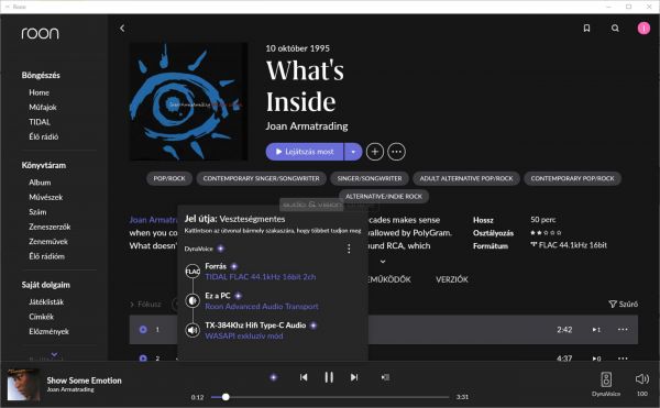 TIDAL, Radio Paradise és fájl alapú lejátszás PC-ről, számtalan formátumban. Roon/Jriver/foobar/ lejátszó programok. Matrix Audio Element H USB kártya.