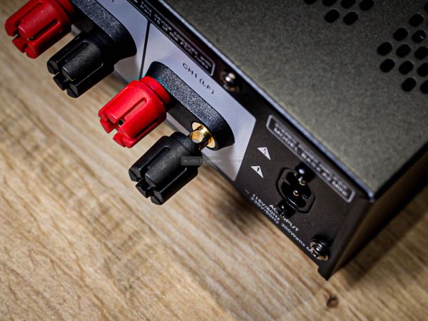 Ezt mutatja a hátoldali "borotvacsatlakozó" is, ami még belefér ebbe a kategóriába. A hangfalcsatlakozók vaskosak, fogadnak banándugót, masszív a műanyag bevonat, és a távolság is megfelelő köztük. Az RCA-bemenet lehet fix és változtatható (tehát végfokként is használható), ezt egy billenőkapcsolóval állíthatjuk, ahogyan azt is, hogy a készülék bekapcsolása automatikus legyen-e, saját rendszeren belül pedig trigger ki és bemenet segít minket a használatban.