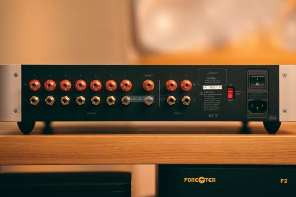 Az előerősítő elején három darab méretes forgatógombot, egy Fezz feliratot és egy távvezérlő használatához szükséges érzékelőt talál a figyelmes szemlélő. A három tekerentyű közül az első a jelszint (hangerő), a második a háromféle lehetőséget kínáló (egy RCA kimenet, egy RCA és egy másik RCA együtt mondjuk egy szubládához, a harmadik állás a második pár RCA kimenet) választó kapcsoló, a harmadik a 8 állású bemenet váltó, amiből egy darab a felesleges jelutak kikerülését lehetővé tévő Direct jelzést kapta. A színválaszték itt is bőséges, lehetősége van válogatni a leendő vevőnek. Ha megfordítjuk a masinát, azonnal feltűnik a csatlakozók bősége, a már említett 8 pár RCA és egy pár Direct RCA bemenet, két pár kimenet, egy Ground (Föld) kapcsoló az esetleges búgás kiküszöbölésére, a cserélhető biztosíték tartója és az IEC tápaljzat.