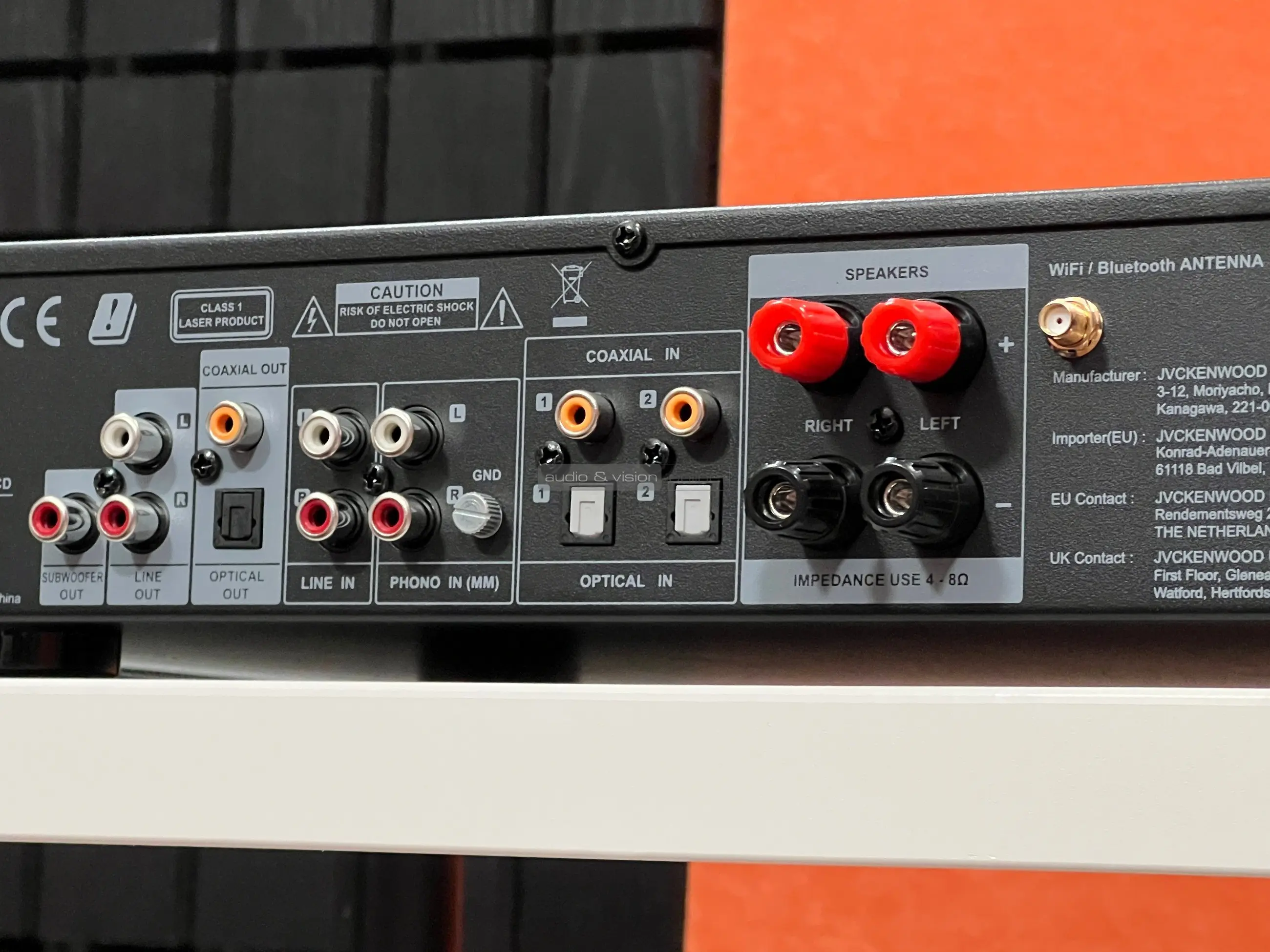 A hátlapon egy pár műanyag bevonatú hangfalkimenetet találunk, mellé csavarozhatjuk fel a Bluetooth antennát, a tápkábel pedig cserélhető. Koaxiális és optikai bemenetből 2-2 darabot kínál, míg kimenetből egyet mindkettőből. Van vonalszintű ki- és bemenet is, találunk földeléssel ellátott phonót (MM), valamint mélyládát is köthetünk rá. A csatlakozókról az aranyozást lefelejtették, de legalább itt is logikusan van minden elhelyezve. Most pedig nézzük a Kenwood KRW-8000SCD-B tudását!