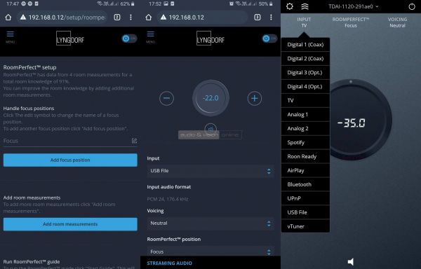 Telefonról sokkal gyorsabban és könnyebben lehet vezérelni, mint a klasszikus IR műanyag féltéglával. Külön applikációt fejlesztett hozzá a Lyngdorf, amivel szinte bármit konfigurálhattunk. Azért csak szinte, mert a fennmaradó elásott finombeállításokat IP-alapon, böngészőből tudtuk elérni... tehát mindent beállíthattunk a telefonról, beleértve a kalibrációt.