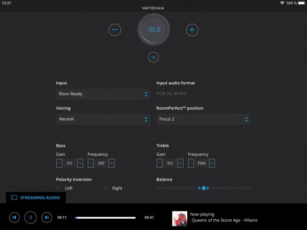 Utóbbi kb. 20 percet vesz igénybe, a procedúrát leírtuk részletesen korábbi tesztünkben, ezért itt nem térünk ki rá újra. Lényegében felhasználóbarát folyamat, nem igényel külön szakembert, feltéve, ha az illető tud angolul és rakott már össze mikrofon állványt. A Roon és TIDAL kliensek támogatottságát nem volt lehetőségünk kipróbálni, de a Spotify villámgyorsan rálelt az erősítőre. Ha elindítottunk egy dalt telefonon és továbbítottuk a TDAI-1120 felé, akkor az 3-4 másodpercen belül bekapcsolt és máris szólt a zene.